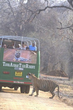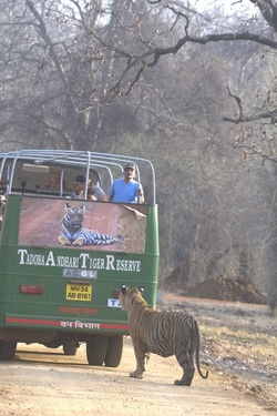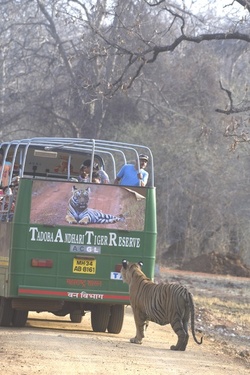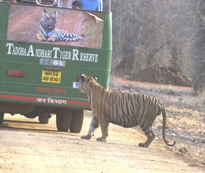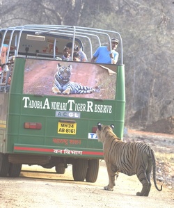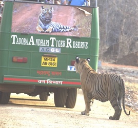 Love at First Sight Tiger By Mahima Kaur **EXCLUSIVE** FUNNY images show a tiger looking at a tigress’ poster on the back of a bus, admiring her beauty. One image shows the tiger looking at the tigress on the poster, probably wondering where he can find her. The images were taken in a jungle in Maharashtra, India where the tigers roam freely. India has the largest number of wild tigers in the world. These images were captured by photographer Vicky Patel (29) using a Nikon D500 and a Nikkor 200-400m lens. “This particular tiger was sitting at a lake and cooling himself,” said Vicky. “After some time, he woke up and got interested in the images of a tigress on the bus. “He kept looking at the poster. “It was a great experience capturing this moment when the tiger was looking at the tigress.” ENDS --